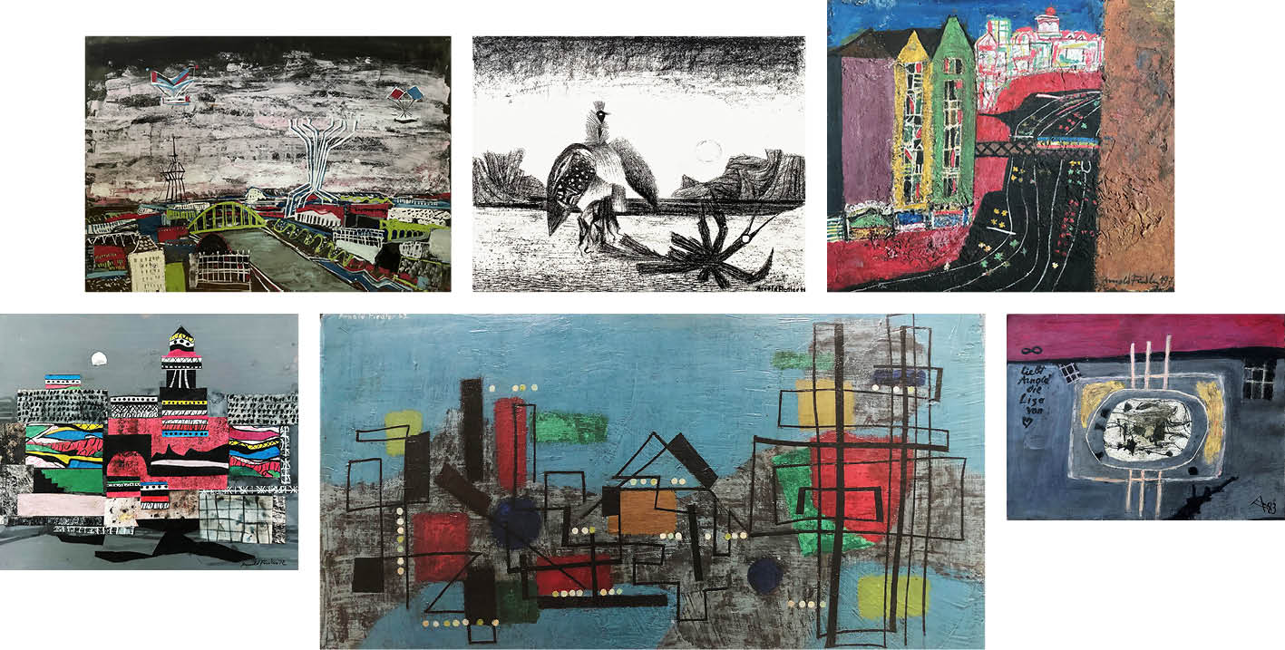 Oben links: Eylert Spars “Säulen in Hellas” (1959), Oben Mitte: Rolf Retz-Schmidt “Raummedium” (1958), Unten links: André Masson “Komposition mit Vogelfrau auf hellblauem Grund” (1972), Unten Mitte: Hermann Otto Kuhlmann “Ohne Titel” (1961), Rechts: Charlotte Hilmer “Badende an der Elbe” (ca. 1930).